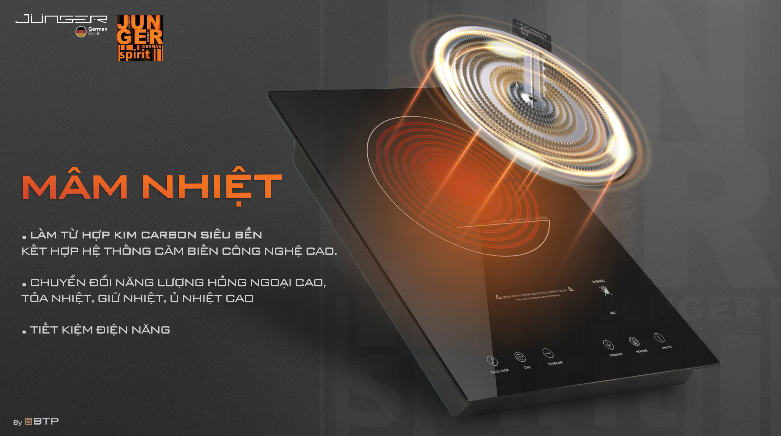 Bếp Junger IS-19 sở hữu mâm nhiệt đường kính 20cm, sử dụng hợp kim Carbon siêu bền. Kết hợp với cảm biến nhiệt công nghệ cao cho tốc độ làm nóng siêu nhanh, khả năng giữ nhiệt lâu, ủ nhiệt cao, từ đó giúp tiết kiệm điện năng tối đa.