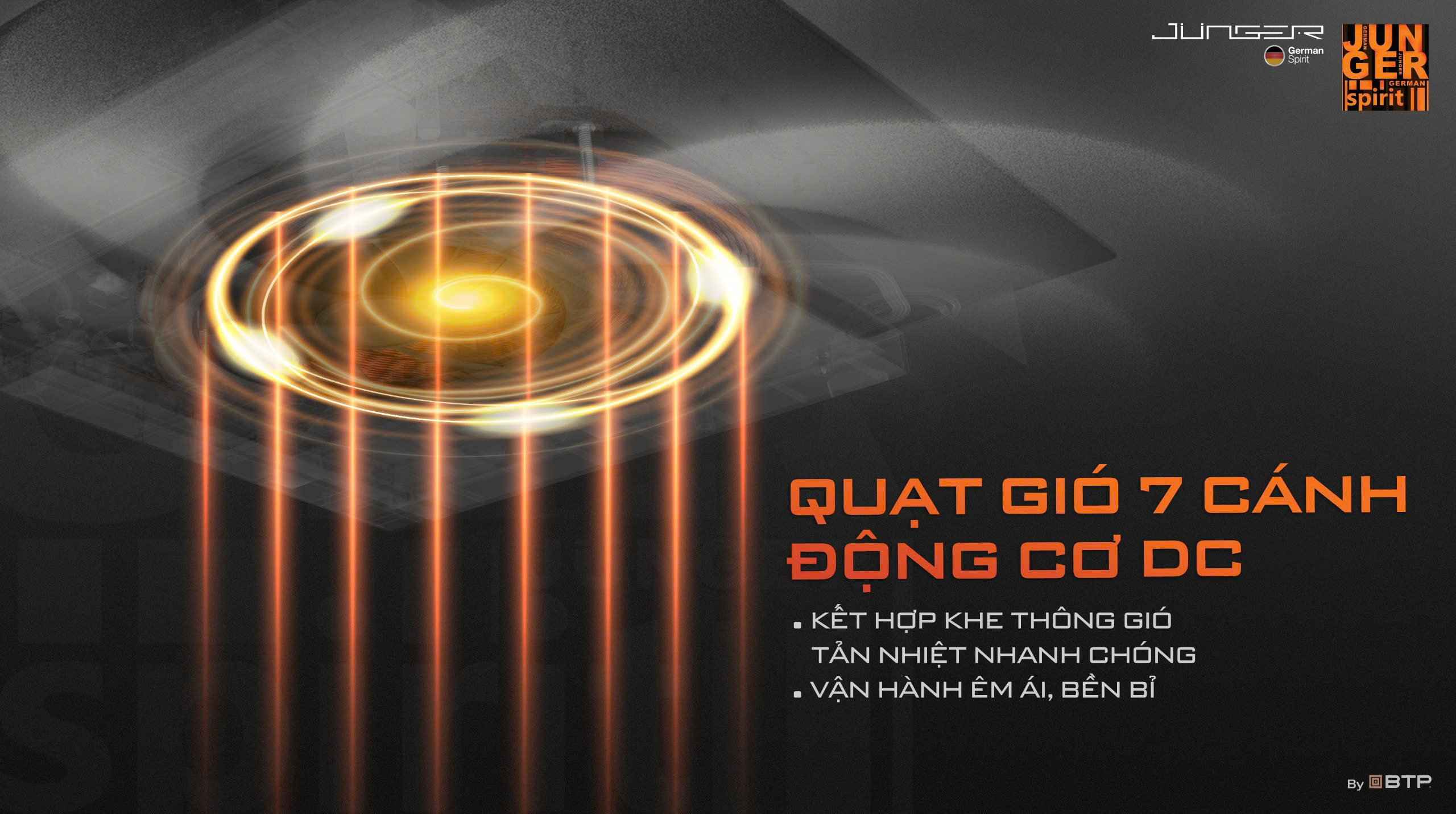 Thiết kế quạt 7 cánh cùng khe thông gió trên khung bếp, động cơ DC hiệu quả tản nhiệt được tối ưu.