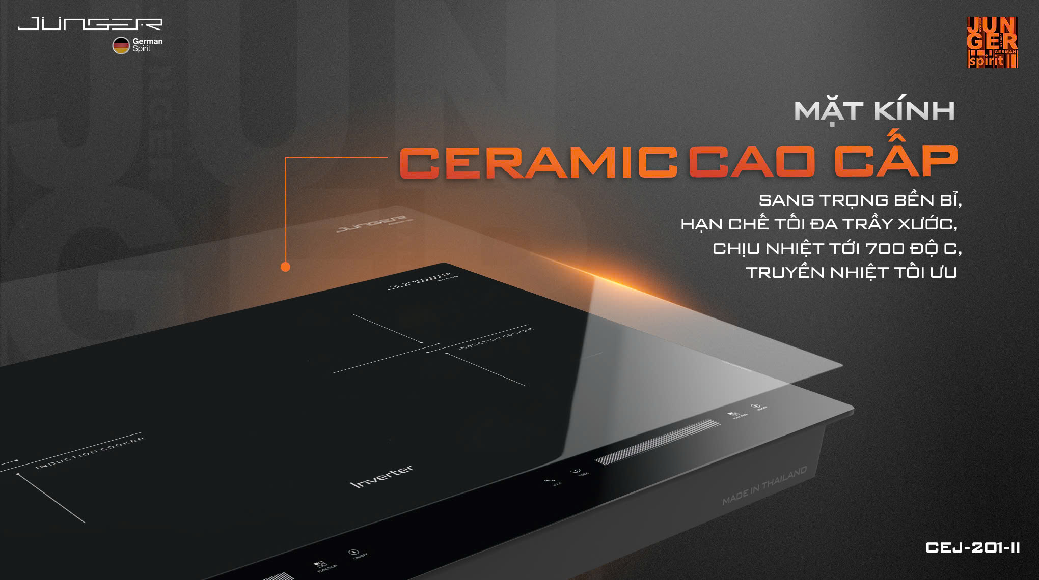 Junger CEJ-201-II được trang bị mặt kính Ceramic cao cấp, sáng bóng với những họa tiết tối giản nhưng không đơn điệu. Đây là một trong những nét đặc trưng trong phong cách gia dụng Đức tạo nên sự lôi cuốn kỳ diệu với những người đam mê đồ dùng hoặc nội thất Châu Âu.