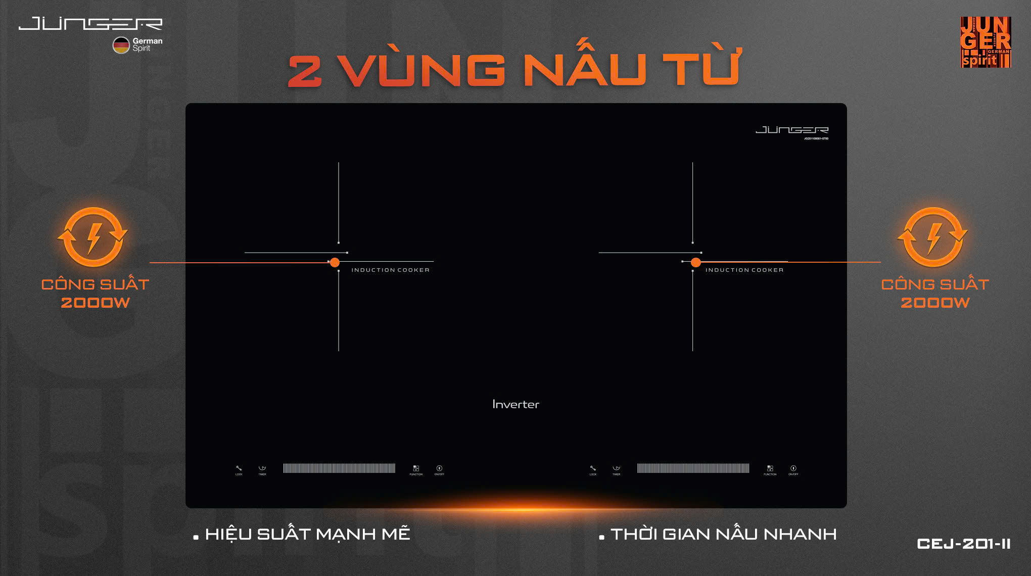 Sở hữu công nghệ tiên tiến bậc nhất của Đức cùng thiết kế sang trọng, bếp từ đôi Junger CEJ-201-II không chỉ mang đến trải nghiệm nấu nướng hoàn hảo mà còn góp phần tô điểm cho không gian bếp hiện đại, khẳng định gu thẩm mỹ và đẳng cấp của người dùng.