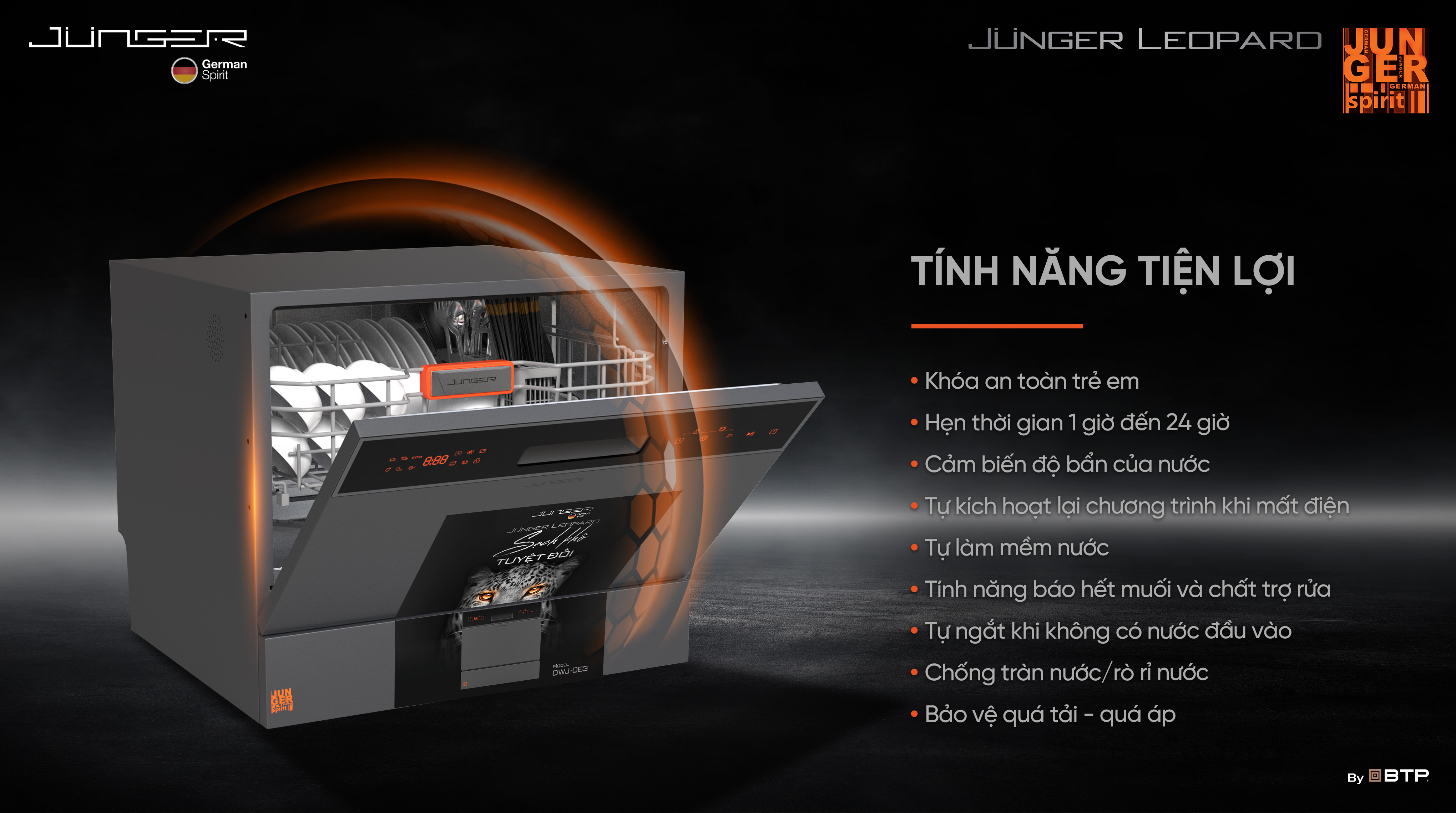 Máy rửa bát Junger Leopard DWJ-063 thuộc dòng sản phẩm Leopard báo xám cao cấp tới từ Đức của Junger. Sản phẩm hội tụ tinh hoa công nghệ cùng với tinh thần mạnh mẽ người Đức mang tới trải nghiệm cuộc sống hiện đại, phong cách và tràn đầy tinh tế.