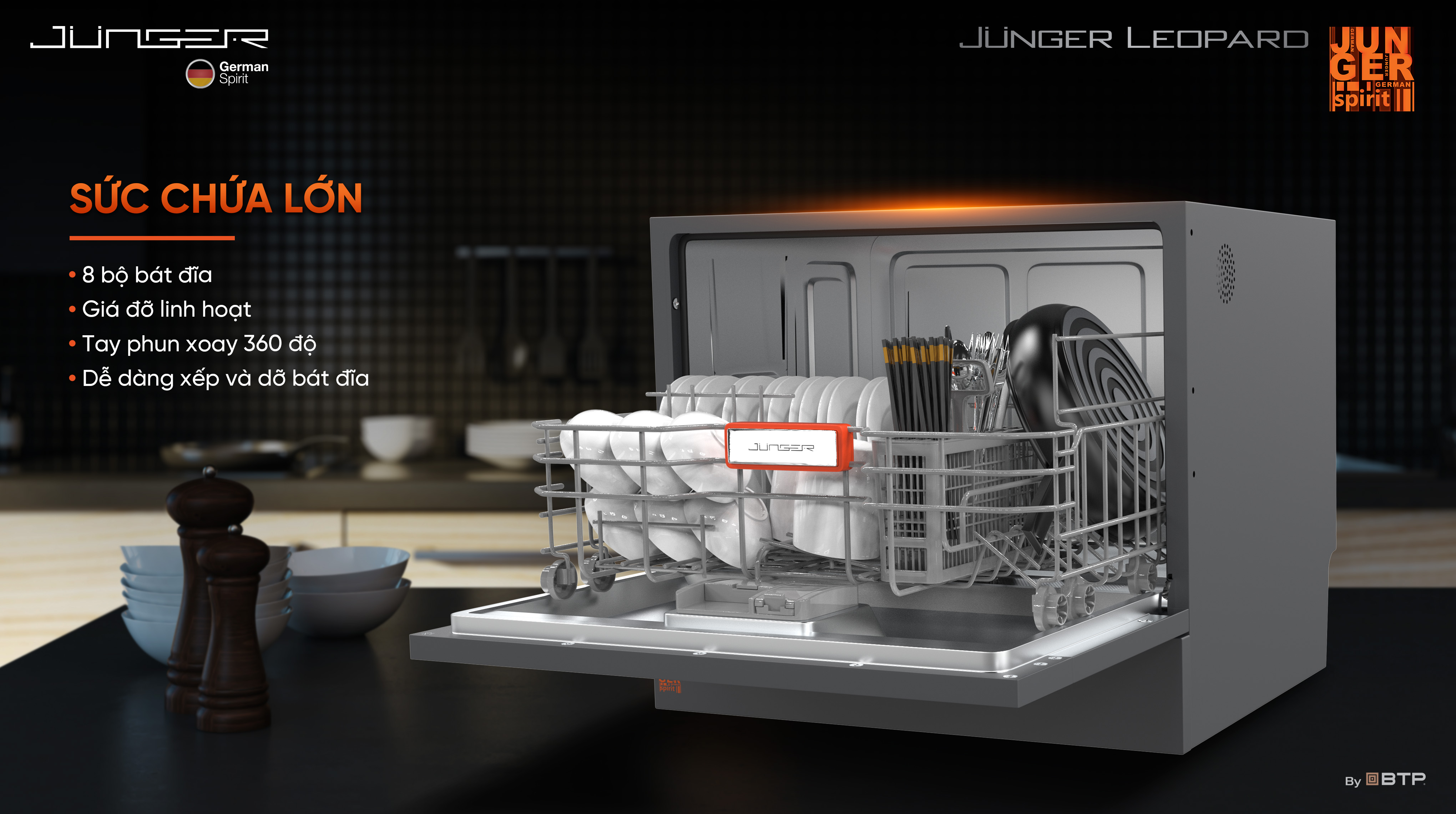 Junger Leopard DWJ-063 được thiết kế có sức chứa 8 bộ bát đĩa Châu Âu tương đương 2~3 bữa ăn Việt Nam. Sở hữu 2 giá đỡ linh hoạt tiện dụng, gỏ cắm dao đũa thìa dĩa dễ dàng. Kết hợp với tay phun nước 360 độ chạm đến mọi góc xoong nồi bát đũa trong khoang rửa mà không bỏ sót bất kỳ vị trí nào đảm bảo làm sạch khô hoàn hảo sáng bóng.