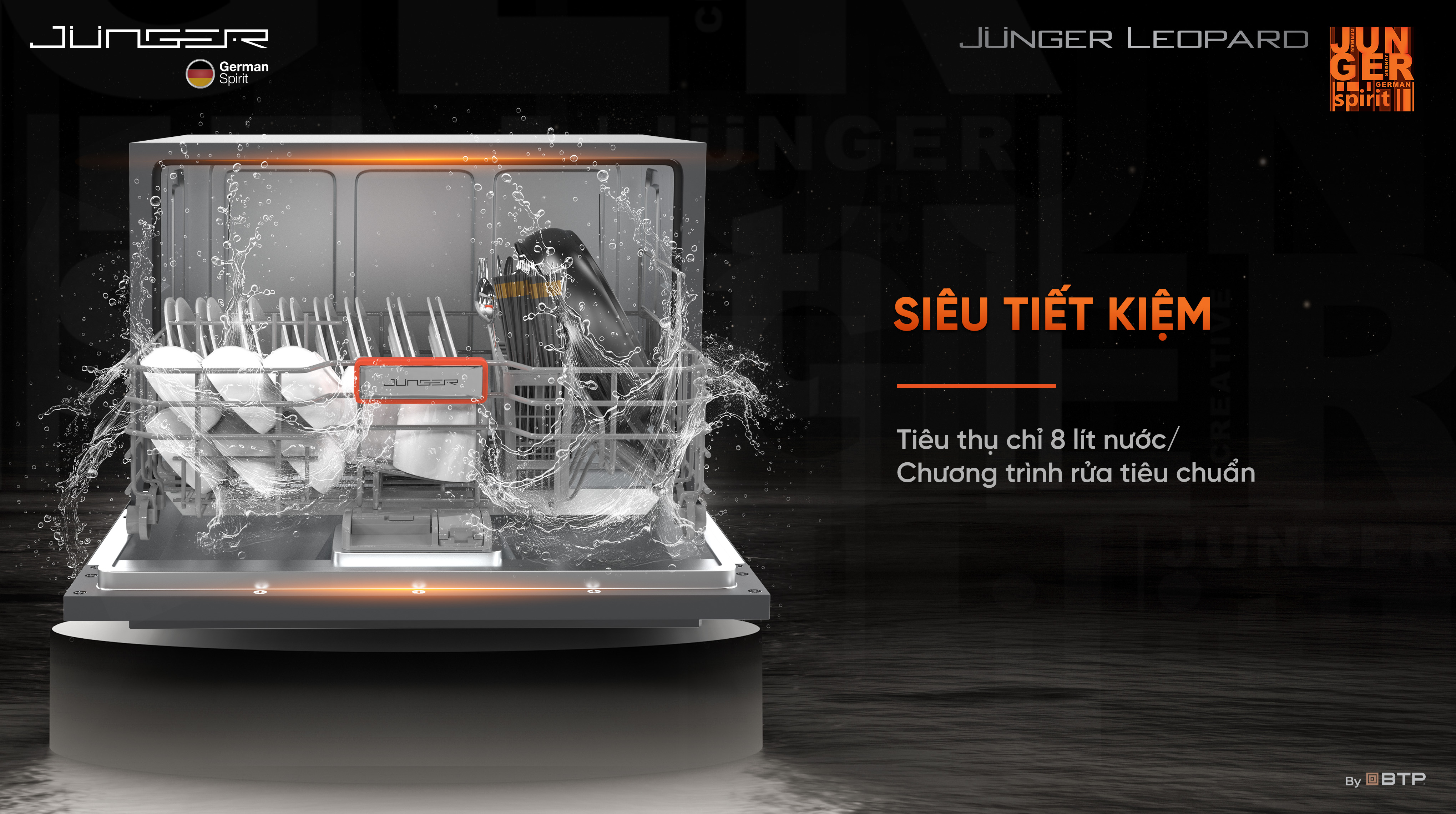 Máy rửa bát Junger DWJ-063 tiêu thụ chỉ 8 lít nước / chương trình rửa tiêu chuẩn, tiết kiệm đáng kể nước so với các loại máy thông thường khác.