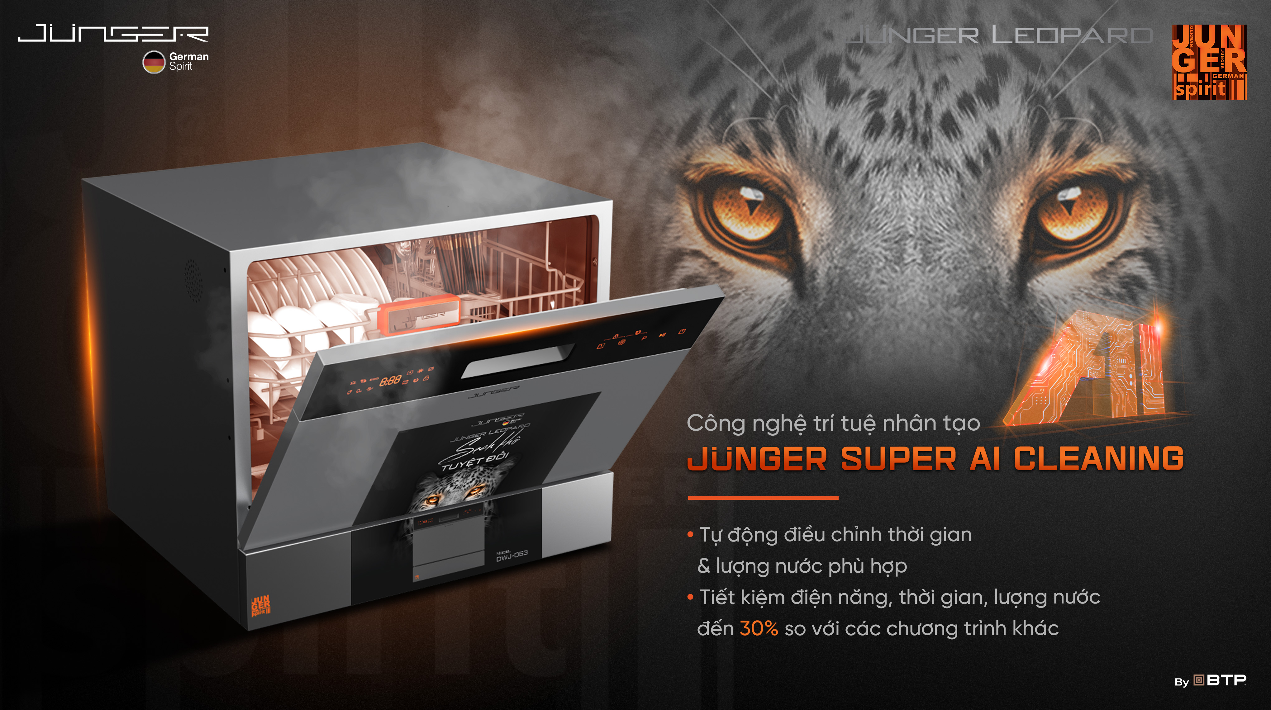 Công nghệ Junger Super AI Cleaning sẽ tự động được chọn mặc định khi bật máy, đây là công nghệ thông minh sử dụng trí tuệ nhân tạo AI, tự động đo độ bẩn của nước rửa, đo độ bẩn của bát đĩa, hệ thống vi xử lý thông minh sẽ tự động căn chỉnh lượng nước và thời gian rửa phù hợp với độ bẩn của bát đĩa giúp tiết kiệm tiết kiệm điện năng, thời gian và lượng nước đến 30% so với các máy rửa bát thông thường.