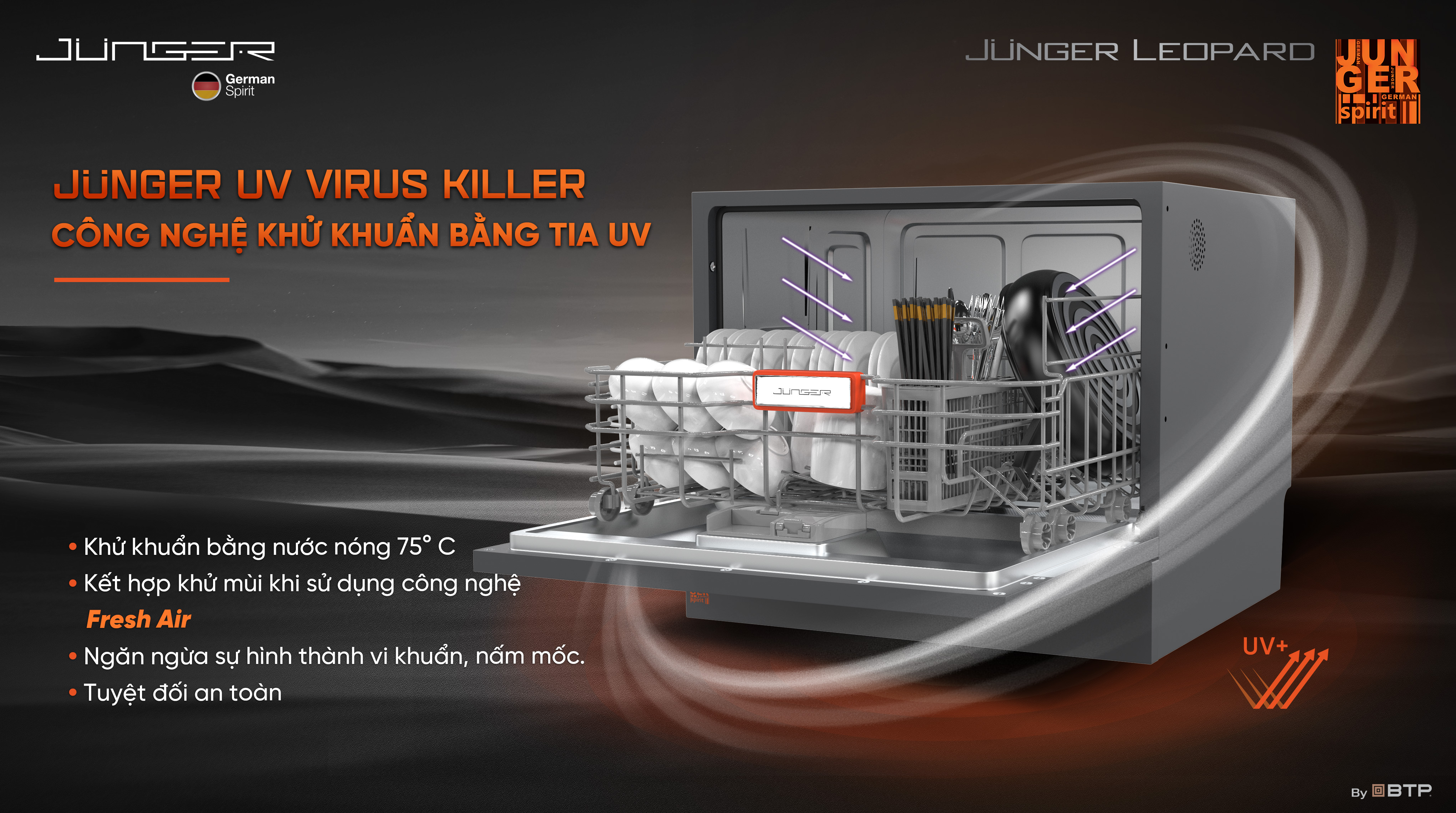 Chức năng khử trùng/diệt khuẩn bằng công nghệ Junger UV Virus Killer Tech có khả năng tiêu diệt đến 99,9% vi khuẩn, ngăn chặn sự hình thành vi khuẩn, nấm mốc và ngăn ngừa mùi hôi bám trên bát đĩa. Từ đó mang đến sự an toàn tuyệt đối cho người sử dụng. Công nghệ này được kích hoạt khi sử dụng chức năng Rửa khử khuẩn 75 độ và chức năng khử mùi bằng gió tươi đối lưu Fresh Air.
