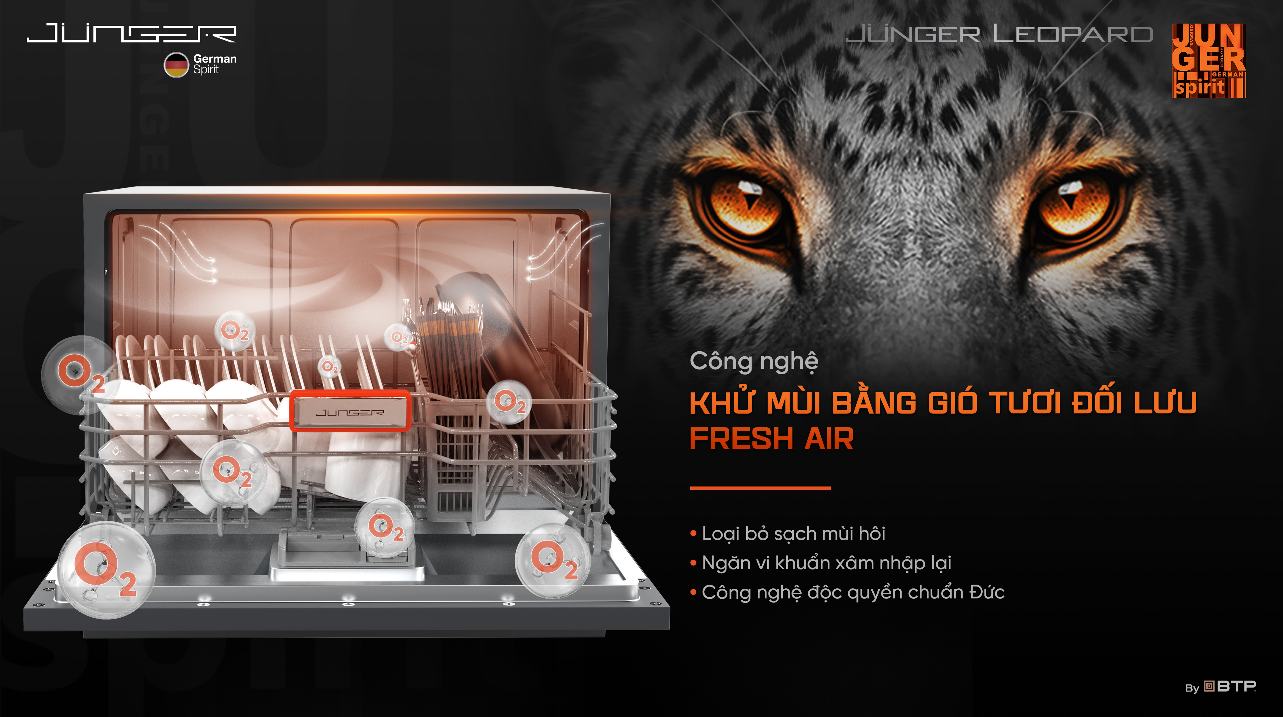 Công nghệ khử mùi bằng gió tươi đối lưu Fresh Air kèm sấy nóng sau khi rửa ngăn ngừa sự ngưng tụ hơi nước lên bát đĩa, ngăn ngừa sự hình thành vi khuẩn, nấm mốc. Giúp ngăn ngừa mùi hôi bám lên bát đĩa hoặc trong khoang máy mà không cần phải mở cửa khoang máy. Kết hợp với công nghệ khử trùng/diệt khuẩn bằng công nghệ Junger UV Virus Killer Tech đem lại hiệu quả sạch và khô tuyệt đối.