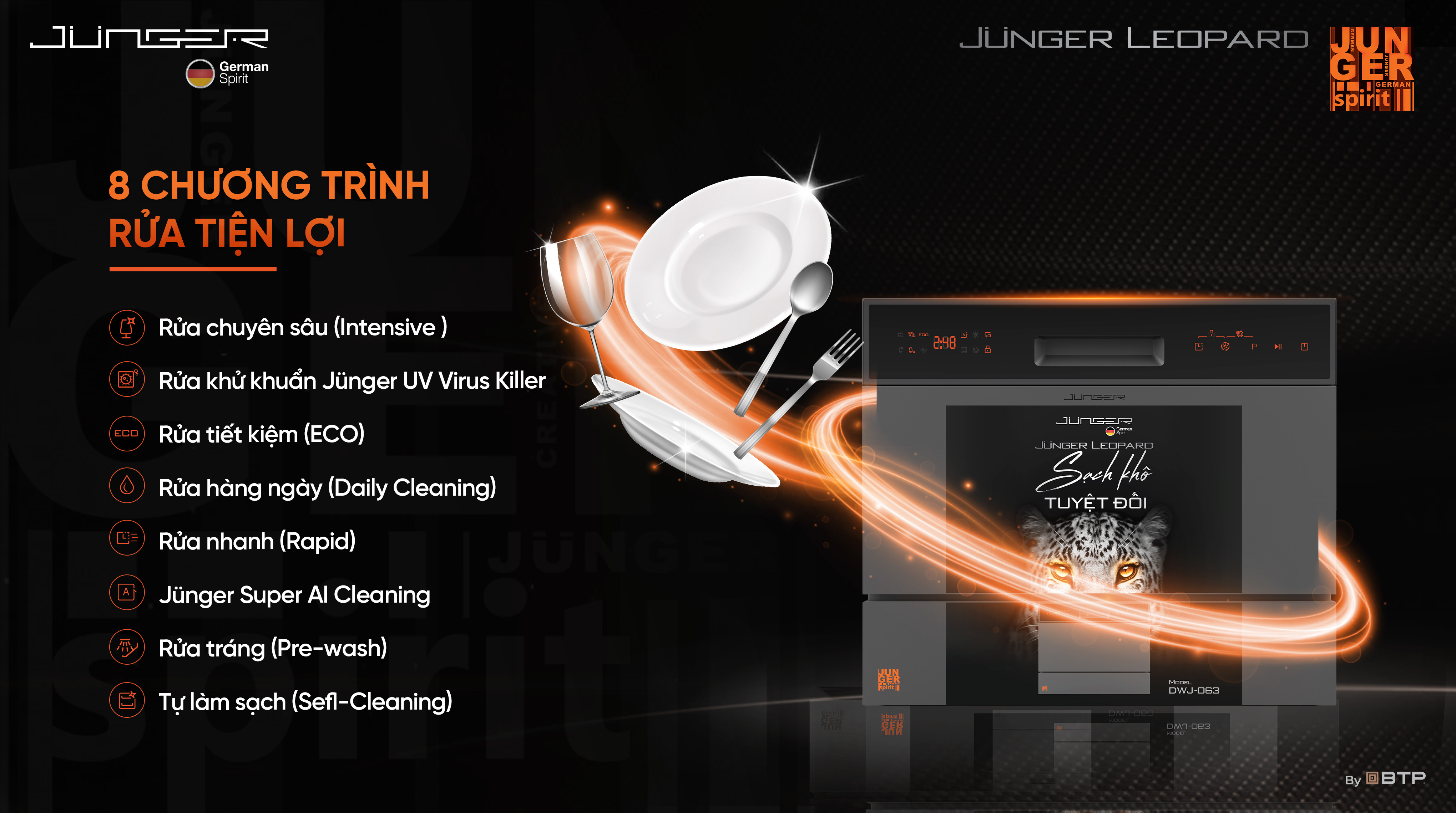 Công nghệ Junger Super AI Cleaning giúp tối ưu hóa các chương trình rửa trên máy như rửa tráng, rửa chính...hỗ trợ chu trình sấy nóng chuyên sâu kết hợp khử khuẩn bằng tia UV...