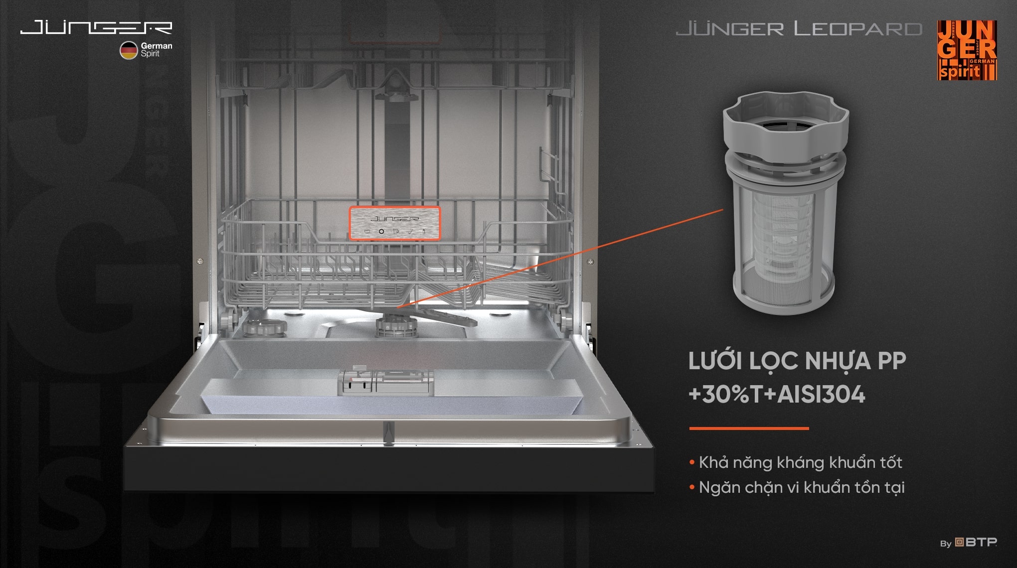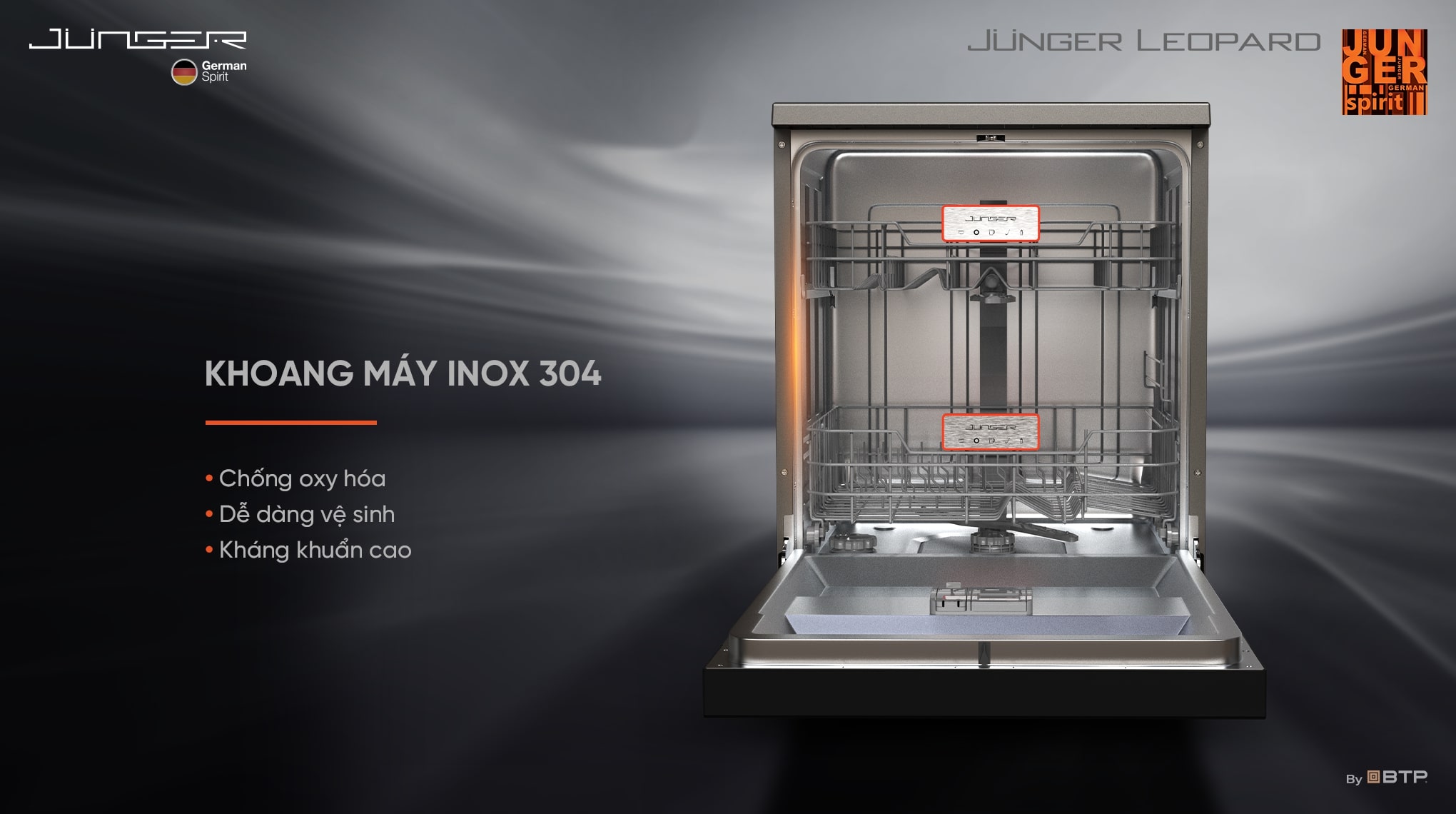 Không chỉ gây ấn tượng ở phần nhìn với lớp vỏ sắc sảo màu Tro Núi Lửa Volcano Grey phủ công nghệ sơn kim loại METALLO STELLARE từ Italy, Máy rửa bát Junger Leopard liên tục phát triển công nghệ đỉnh cao, hướng tới chuẩn mực SẠCH KHÔ TUYỆT ĐỐI và đảm bảo sức khỏe gia đình.